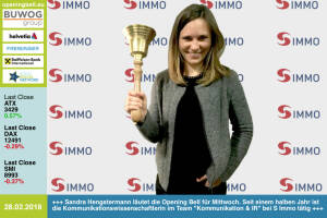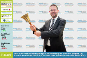 1.3.: Klaus Gerdes läutet die Opening Bell für Donnerstag und damit auch den März. Der Vorstand Sanochemias lieferte 2018 die bisher beste Aktienperformance aller Austro AGs http: www.sanochemia.at .Sanochemia war gestern auch Teilnehmer bei der Roadshow #75 , siehe Präsentation unter http: www.boerse-social.com page index 3423 , Bilder zum Event unter http: www.boerse-social.com page index 3427 www.facebook.com groups GeldanlageNetwork #goboersewien 28.2.: Sandra Hengstermann läutet die Opening Bell für Mittwoch. Seit einem halben Jahr ist die Kommunikationswissenschaftlerin im Team Kommunikation & IR bei der S Immo tätig www.simmoag.at www.facebook.com groups GeldanlageNetwork #goboersewien 27.2.: Johannes Allesch läutet die Op... » Weiterlesen