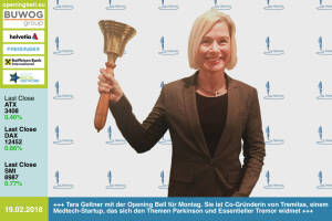 19.2.: Tara Geltner mit der Opening Bell für Montag. Sie ist Co-Gründerin von Tremitas, einem Medtech-Startup, das sich den Themen Parkinson und Essentieller Tremor widmet http: www.tremitas.com www.facebook.com groups GeldanlageNetwork #goboersewien 16.2.: Toni Polster läutet die Opening Bell für Freitag. Österreichs Jahrhunderttorschütze und UEFA Pro Lizenz Trainer ist bei Sports.Selection u.a. als Testimonial und Influencer buchbar www.heralic.at sports-selection-1 http: www.toni-shirts.at www.facebook.com groups Sportsblogged 15.2.: Irene Bučnik läutet die Opening Bell für Donnerstag. Die PKF-Graz-Dame checkt mit dem Börse Social Network B2B-Stammtische für Unternehmen und Investoren, zuletzt Healthtech http: www.pkf-gra... » Weiterlesen