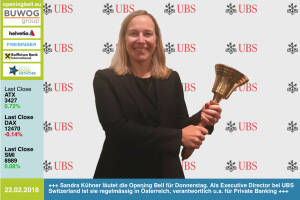 22.2.: Sandra Kühner läutet die Opening Bell für Donnerstag. Als Executive Director bei UBS Switzerland ist sie regelmässig in Österreich, verantwortlich u.a. für Private Banking www.ubs.com at de.html www.facebook.com groups GeldanlageNetwork #goboersewien 21.2.: Markus Hütter läutet die Opening Bell für Mittwoch. Der CEO und Gründer von BHS Technologies entwickelt mit seiner Company ein Produkt für die Mikrochirurgie http: www.bhs-technologies.com www.facebook.com groups GeldanlageNetwork #goboersewien 20.2.: Avi Kravitz läutet die Opening Bell für Dienstag. Der CTO von CyberTrap lockt Hacker mit der Deception Technology in eine überwachte Umgebung, Details unter goo.gl SoGZSb http: www.cybertrap.com ... » Weiterlesen