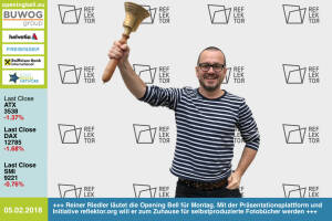 7.2.: Andreas Seling läutet die Opening Bell für Mittwoch. Der IP- und Social Media-Experte bei der Dorda Rechtsanwälte GmbH berät und hält laufend Vorträge zu diesen Themengebieten http: www.dorda.at www.facebook.com groups GeldanlageNetwork #goboersewien 6.2.: Andreas Nemeth läutet die Opening Bell für Dienstag. Der Head of Uniqa Ventures holte bsurance, ein österreichisches Insurtech-Startup mit Fokus auf B2B2C, ins Portfolio http: www.uniqa.at www.facebook.com groups GeldanlageNetwork #goboersewien 5.2.: Reiner Riedler läutet die Opening Bell für Montag. Mit der Präsentationsplattform und Initiative reflektor.org will er zum Zuhause für selbstproduzierte Fotobücher werden http: reflektor.org html www.... » Weiterlesen