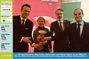 31.1.: Christoph Boschan , Heike Arbter , Heiko Geiger und Pedram Payami mit der Opening Bell für Mittwoch. Der Börse-Chef und die ZFA-Vorstände läuten im Zuge des Zertifikate-Jahresauftakts live an der Wiener Börse http: www.zertifikateforum.at http: www.wienerborse.at www.facebook.com groups GeldanlageNetwork #goboersewien 30.1.: Klaus Einfalt läutet die Opening Bell für Dienstag. Der Vorstand der börsenotierten SW Umwelttechnik ist mit seinem Unternehmen auf Messetour im Burgenland und Salzburg http: en.sw-umwelttechnik.com www.facebook.com groups GeldanlageNetwork #goboersewien 29.1.: Sabine Gstöttner läutet die Opening Bell für Montag. Mit ihrem Planungsbüro inspirin gestaltet sie Stadt: bottom up, mit unkonventio... » Weiterlesen