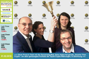 1.2. : Oliver Prock und sein Team mit der Opening Bell für Donnerstag. Salus Alpha hat gerade „Smarter Than Crypto“, ein aktiv gemanagtes Portfolio der Top20 Crypto-Währungen, in Zeichnung www.smarterthancrypto.com pre-sale_nl1.html www.facebook.com groups GeldanlageNetwork #goboersewien 31.1.: Christoph Boschan , Heike Arbter , Heiko Geiger und Pedram Payami mit der Opening Bell für Mittwoch. Der Börse-Chef und die ZFA-Vorstände läuten im Zuge des Zertifikate-Jahresauftakts live an der Wiener Börse http: www.zertifikateforum.at http: www.wienerborse.at www.facebook.com groups GeldanlageNetwork #goboersewien 30.1.: Klaus Einfalt läutet die Opening Bell für Dienstag. Der Vorstand der börsenotierten SW Umwelttechnik ist ... » Weiterlesen