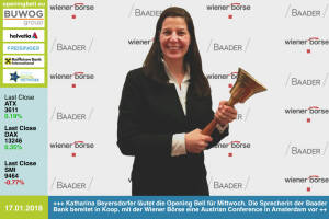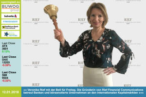 12.1.: Veronika Rief läutet die Opening Bell für Freitag. Die Gründerin von Rief Financial Communications betreut Banken und börsenotierte Unternehmen an den internationalen Kapitalmärkten http: www.riefcom.at www.facebook.com groups GeldanlageNetwork #goboersewien 11.1.: Jonas Untermoser läutet die Opening Bell für Donnerstag. wesual.at liefert visuelle Unter-nehmensauftritte und Präsentationen dank der neuartigen Digital Signage Lösung http: www.wesual.at www.facebook.com groups GeldanlageNetwork #goboersewien 10.1.: Barbara Duras läutet die Opening Bell für Mittwoch. Die Journalistin und Moderatorin (u.a. Ex-Forbes, -Brutkasten) tut dies vor einer Spanien-Logowall, weil sie ebendort hinzieht www.facebook.com groups Geldanlag... » Weiterlesen