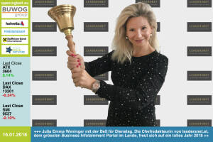 16.1.: Julia Emma Weninger läutet die Opening Bell für Dienstag. Die Chefredakteurin von http: www.leadersnet.at, dem grössten Business Infotainment Portal im Lande, freut sich auf ein tolles Jahr 2018 www.facebook.com groups GeldanlageNetwork #goboersewien 15.1.: HelloFresh mit der Opening Bell für Montag. Der Lebensmittel-Lieferdienst und Anbieter von Kochboxen ist seit Anfang November 2017 an der Börse in Frankfurt gelistet www.hellofreshgroup.com www.facebook.com groups GeldanlageNetwork 12.1.: Veronika Rief läutet die Opening Bell für Freitag. Die Gründerin von Rief Financial Communications betreut Banken und börsenotierte Unternehmen an den internationalen Kapitalmärkten http: www.riefcom.at www.facebook.com groups GeldanlageN... » Weiterlesen