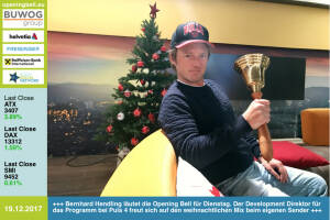 19.12.: Bernhard Hendling läutet die Opening Bell für Dienstag. Der Development Direktor für das Programm bei Puls 4 freut sich auf den weihnachtlichen Mix beim eigenen Sender www.puls4.com www.facebook.com groups GeldanlageNetwork #goboersewien 18.12.: Christina Noélle läutet die Opening Bell für Montag. Auf ihren Reisen für Ausstellungen und Shootings entstand der Selfshot-Kalender "Einmal um die Welt mit Christina Noélle", zu bestellen unter christina.noelle.photography@gmail.com um 43€ (exklusive Versand), alle handsigniert, auf Wunsch mit Widmung http: www.christina-noelle.com 15.12.: Manuel Ortlechner läutet die Opening Bell für Freitag. Der Ex-Kicker gewann bei der 10. "Business Athlete Award"-Vergabe für seine Ak... » Weiterlesen