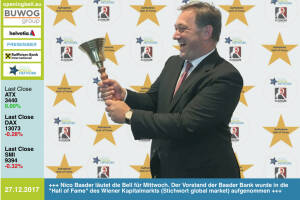 27.12.: Nico Baader läutet die Opening Bell für Mittwoch. Der Vorstand der Baader Bank wurde in die "Hall of Fame, Class of 2017" für den Wiener Kapitalmarkt (Stichwort global market) aufgenommen http: www.boerse-social.com hall-of-fame www.facebook.com groups GeldanlageNetwork #goboersewien 22.12.: Michael Wernbacher mit der Opening Bell für Freitag. Unter www.facebook.com groups Sportsblogged wird von 25.12. bis 6.12. wieder der "Sportschnappschuss des Jahres" gesucht.. Die Nr.1 bekommt vom Wemove Runningstore-Chef 250 Euro in Ausrüstung . Alle Infos ab 25.12. unter o.a. Gruppe. http: www.wemove.at www.facebook.com groups Sportsblogged #runpluggedlaufstark . Das waren die eingereichten Bilder 2016: http: www.runplugged.com 2016 12 26 sportschnappschuss_201... » Weiterlesen