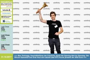 31.10.: Max Tertinegg , Geschäftsführer der Coinfinity, läutet die Opening Bell für Dienstag. Der Bitcoin-Spezialist aus Graz freut sich aktuell über BTC-Kurse jenseits der 5000 Euro, coinfinity.co http: www.boerse-social.com goboersewien www.facebook.com groups GeldanlageNetwork 30.10.: Alfred Reisenberger und Lukas Stipkovich läuten die Opening Bell für Montag. Am 7.11. werden sie ihren Sigma Alfa European Opportunities Fonds bei der Börse Social Network Roadshow #74 vorstellen http: sigma-investment.at http: www.boerse-social.com roadshow http: www.boerse-social.com goboersewien www.facebook.com groups GeldanlageNetwork 27.10.: Johannes Eichmayer , Stefan Kainz und Stefan Greunz läuten die Opening Bell für Freitag. A... » Weiterlesen