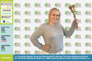 25.9. : Franziska Bässler läutet die Opening Bell für Montag. Die Online-Marketing-Expertin der AB Wirtschaftsdienst GmbH (u.a. Austria Börsenbrief) bastelt gerade an einem Jubiläums Special www.boersenbrief.at www.facebook.com groups GeldanlageNetwork #goboersewien 22.9.: Christoph Sander läutet die Opening Bell für Freitag. Der österreichische Spitzenläufer und Querdenker wird am 26.9. beim Vienna Night Run in den Runplugged-Farben starten http: www.runplugged.com www.facebook.com groups Sportsblogged 21.9.: Thomas Farthofer läutet die Opening Bell für Donnerstag. Der Ex-Investmentbanker aus Wien baut und finanziert via "Sao Bien - Room for Education" Schulen in Vietnam www.facebook.com saobienroomforeducation www.face... » Weiterlesen