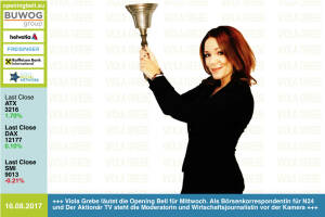 16.8.: Viola Grebe läutet die Opening Bell für Mittwoch. Die Moderatorin und Wirtschaftsjournalistinsteht alsBörsenkorrespondentin für N24 und Der Aktionär TV vor der Kamera http: www.viola-grebe.de www.facebook.com groups GeldanlageNetwork #goboersewien 14.8.: Christina Hiptmayr läutet die Opening Bell für Montag. Die profil-Wirtschaftsredakteurin checkte für das Börse Social Magazine die Übernahme des ATX-Teils aus einem genialen profil-Interview mit Harald Schmidt . Danke! www.profil.at http: www.boerse-social.com magazine www.facebook.com groups GeldanlageNetwork #goboersewien 11.8.: Tjark Schütte , Investor Relations Deutsche Post DHL Group, läutet die Opening Bell für Freitag. Die Aktie ist eine von nur 4 Ti... » Weiterlesen