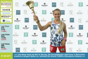19.8.: Julia Mayer läutet die Opening Bell für Montag. Die Sportpädagogin stieß heuer in Österreichs erweiterte Laufsport-Spitze vor, ihr nächstes Ziel ist der Laufpart der Staffel beim Austria Triathlon (Olympische Distanz) www.juliamayer.at http: www.runinc.at saysky.dk www.facebook.com groups Sportsblogged 18.8.: Christina Öhler, Marketing wikifolio, mit der Opening Bell für Freitag. wikifolio sucht in einer Teilwertung des Smeil Award den besten Social Trading Blog. Das Voting läuft unter http: www.smeil-award.com bis Monatsende http: www.wikifolio.com www.facebook.com groups GeldanlageNetwork #goboersewien 17.8.: Thomas Birtel , Gregor Rosinger und Wolfgang Matejka läuten die Opening Bell für Donnerstag. Stra... » Weiterlesen