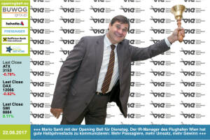 22.8.: Mario Santi mit der Opening Bell für Dienstag. Der IR-Manager des Flughafen Wien hat gute Halbjahresfacts zu kommunizieren: Mehr Passagiere, mehr Umsatz, mehr Gewinn http: www.viennaairport.com www.facebook.com groups GeldanlageNetwork #goboersewien 21.8.: Julia Mayer läutet die Opening Bell für Montag. Die Sportpädagogin stieß heuer in Österreichs erweiterte Laufsport-Spitze vor, ihr nächstes Ziel ist der Laufpart der Staffel beim Austria Triathlon (Olympische Distanz) www.juliamayer.at http: www.runinc.at saysky.dk www.facebook.com groups Sportsblogged 18.8.: Christina Öhler, Marketing wikifolio, mit der Opening Bell für Freitag. wikifolio sucht in einer Teilwertung des Smeil Award den besten Social Trading Blog. Das Vo... » Weiterlesen