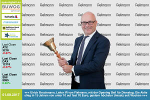 1.8.: Ulrich Brockmann , Leiter IR von Fielmann, läutet die Opening Bell für Dienstag. Die Aktie stieg in 15 Jahren von unter 10 auf fast 70 Euro, gestern gab es den höchsten Handelsumsatz seit Wochen www.fielmann.at www.facebook.com groups GeldanlageNetwork 31.7.: Andreas Du-Rieux läutet die Opening Bell für Montag. Der Neo-Schauspieler schreibt gerade ein Buch über das Championsprinizip mit u.a. Lauda, Messner, Muster, Vonn & Dorfmeister. Er läutet im Rahmen der RunInc.-Invitation http: www.runinc.at http: www.runplugged.com www.facebook.com groups Sportsblogged 28.7.: Katharina Schiffl läutet die Opening Bell für Freitag. Die Berufsfotografin ist in den kommenden Tagen bei der Beachvolley-WM auf der Wiener Donauinsel im Dauer... » Weiterlesen