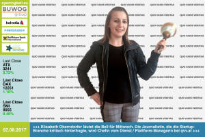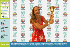 3.8.: Martina Nemeth-Beran läutet die Opening Bell für Donnerstag. Die Ex-Managerin im Kapitalmarktumfeld (Banken, Zertifikate) ist begeisterte Hobbysportlerin (daher läutet sie im Rahmen der RunInc.-Invitation) und Mutter http: www.runinc.at http: www.runplugged.com www.facebook.com groups Sportsblogged 2.8.: Elisabeth Oberndorfer läutet die Opening Bell für Mittwoch. Die Journalistin, die die Startup-Branche kritisch hinterfragte, wird Chefin vom Dienst Plattform-Managerin bei Quo Vadis Veritas http: www.qvv.at www.facebook.com groups GeldanlageNetwork #goboersewien 1.8.: Ulrich Brockmann , Leiter IR von Fielmann, läutet die Opening Bell für Dienstag. Die Aktie stieg in 15 Jahren von unter 10 auf fast 70 Euro, gestern gab es den höch... » Weiterlesen