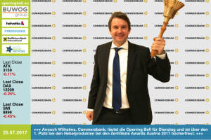 25.7.: Anouch Wilhelms , Commerzbank, läutet die Opening Bell für Dienstag und ist über den 1. Platz bei den Hebelprodukten bei den Zertifikate Awards Austria 2017 hocherfreut www.zertifikate.commerzbank.de www.facebook.com groups GeldanlageNetwork #goboersewien 24.7.: Michael Höllerer , RBI, läutet die Opening Bell für Montag. Es ist zugleich der Final Call für Fintech Startups, die Einreichungsfrist unter http: www.elevator-lab.com endet am 31.Juli www.facebook.com groups GeldanlageNetwork #goboersewien Aktuelles Interview: http: boerse-social.com 2017 07 19 rbi_elevator_lab_mehr_als_100_einreichungen_und_ev_initialzundung_fur_eigenen_vc-fonds_1 21.7.: Karolina Rechul mit der Opening Bell für Freitag im Rahmen der RunInc-Invitation fü... » Weiterlesen