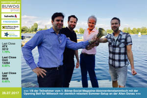 26.7.: 1 8 der Teilnehmer vom 1. Börse-Social-Magazine-Abonnentenstammtisch mit der Opening Bell für Mittwoch vor ziemlich relaxtem Sommer-Setup an der Alten Donau http: www.boerse-social.com magazine www.facebook.com groups GeldanlageNetwork #goboersewien . Den nächsten Stammtisch gibt es am 16. August. Einladung an die Abonnenten folgt ... 25.7.: Anouch Wilhelms , Commerzbank, läutet die Opening Bell für Dienstag und ist über den 1. Platz bei den Hebelprodukten bei den Zertifikate Awards Austria 2017 hocherfreut www.zertifikate.commerzbank.de www.facebook.com groups GeldanlageNetwork #goboersewien 24.7.: Michael Höllerer , RBI, läutet die Opening Bell für Montag. Es ist zugleich der Final Call für Fintech Startups, die Einreichungsfr... » Weiterlesen