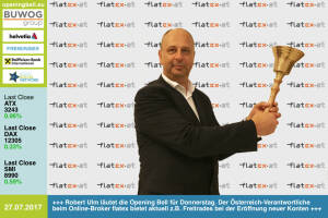 27.7.: Robert Ulm läutet die Opening Bell für Donnerstag. Der Österreich-Verantwortliche beim Online-Broker flatex bietet aktuell z.B. Freitrades bei der Eröffnung neuer Konten http: www.flatex.at www.facebook.com groups GeldanlageNetwork #goboersewien 26.7.: 1 8 der Teilnehmer vom 1. Börse-Social-Magazine-Abonnentenstammtisch mit der Opening Bell für Mittwoch vor ziemlich relaxtem Sommer-Setup an der Alten Donau http: www.boerse-social.com magazine www.facebook.com groups GeldanlageNetwork #goboersewien . Den nächsten Stammtisch gibt es am 16. August. Einladung an die Abonnenten folgt ... 25.7.: Anouch Wilhelms , Commerzbank, läutet die Opening Bell für Dienstag und ist über den 1. Platz bei den Hebelprodukten bei den Zertifikate Aw... » Weiterlesen