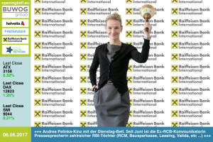 6.6.: Andrea Pelinka-Kinz mit der Opening Bell für Dienstag. Seit Juni fungiert die Ex-RCB-Kommunikatorin als Pressesprecherin zahlreicher RBI-Töchter (Raiffeisen Capital Management, Raiffeisen Bausparkasse, Raiffeisen Leasing, Valida, Raiffeisen Factor Bank, Raiffeisen e-force, Raiffeisen Wohnbaubank) http: www.rbinternational.com www.facebook.com groups GeldanlageNetwork 2.6.: Barbara Potisk-Eibensteiner läutet die Opening Bell für Freitag. Als RHI-CFO kann sie sich auch über die Aktienkursentwicklung freuen: ATX-Nr.1 im Mai und der beste Start in den Juni http: www.rhi-ag.com www.facebook.com groups GeldanlageNetwork 1.6.: Die Wiener Börse Preis Damen läuten die Opening Bell für Donnerstag. Bei der bereits 10. Austragung wurden gestern vo... » Weiterlesen
