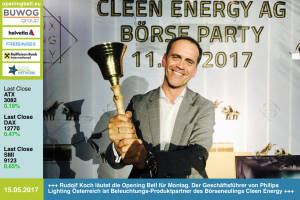15.5.: Rudolf Koch läutet die Opening Bell für Montag. Der Geschäftsführer von Philips Lighting Österreich ist Beleuchtungs-Produktpartner des Börseneulings Cleen Energy http: www.lighting.philips.at http: www.cleen-energy.com www.facebook.com groups GeldanlageNetwork 12.5.: Moderatorin Claudia Stöckl und Vorstand Lukas Scherzenlehner mit der Opening Bell für Freitag. Erstmals seit langem gab es gestern in Wien wieder eine Börsegangs-Party: Cleen Energy http: www.cleen-energy.com www.facebook.com groups GeldanlageNetwork 11.5.: Karin Steinbichler mit der Donnerstag-Bell. Die Kommunikationschefin Wienerbergers brachte gestern starke Zahlen zum Q1, die Aktie ist year-to-date ca. 34 Prozent im Plus http: www.wienerberger.co... » Weiterlesen