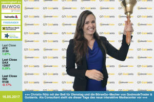 11.5.: Karin Steinbichler mit der Donnerstag-Bell. Die Kommunikationschefin Wienerbergers brachte gestern starke Zahlen zum Q1, die Aktie ist year-to-date ca. 34 Prozent im Plus http: www.wienerberger.com www.facebook.com groups GeldanlageNetwork 10.5.: Gerald Hörhan läutet die Opening Bell für Mittwoch. Der Investment Punk, Investor und Autor diskutierte gestern bei einem Event von S Immo DerStandard über die Generation Y und Geld. Dies zum bevorstehenden Auftakt von http: www.aktientrophy.at http: www.investmentpunk.at http: www.derstandard.at www.facebook.com groups GeldanlageNetwork 9.5. : Magdalena Lobnig läutet die Opening Bell für Dienstag. Die Europameisterin 2016 und mehrfache Staatsmeisterin im Rudern wurde am Weekend bei ihrem Weltc... » Weiterlesen