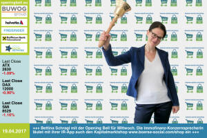 19.4.: Bettina Schragl mit der Opening Bell für Mittwoch. Die Immofinanz-Konzernsprecherin läutet mit ihrer IR-App auch den Kapitalmarktshop http: www.boerse-social.com shop ein http: www.immofinanz.com www.facebook.com groups GeldanlageNetwork 18.4.: Josef Pühringer mit der Opening Bell für Dienstag. Der nunmehrige Alt-LH läutet via Börse Social Magazine den OÖ10 Aktienindex ein, sagt den starken börsenotierten OÖ-AGs "Danke" für die Performance, siehe http: www.boerse-social.com ooe10 bzw. http: www.boerse-social.com magazine www.facebook.com groups GeldanlageNetwork 13.4.: Philipp Haas mit der Opening Bell für Donnerstag. Der Macher von http: investresearch.net ist Smeil-Award-Titelverteidiger bei den Social Trad... » Weiterlesen