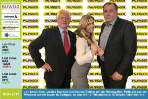 10.4.: Anton Graf , Jessica Kotroba und Hannes Roither mit der Opening Bell für Montag. Palfinger war am Weekend auf der Invest in Stuttgart und ist dort mit 18 Teilnahmen in 18 Jahren Rekordhalter http: www.palfinger.com www.facebook.com groups GeldanlageNetwork 7.4.: Milena Ioveva läutet die Opening Bell für Freitag. 2016 war das zweitbeste Jahr in der 144-jährigen Geschichte von Immobilienentwickler UBM, mehr dazu unter http: www.ubm.eu de news-presse alle-news 6.4.: Christian Drastil, Napoleon und Ritschy Dobetsberger läuten die Opening Bell für Donnerstag. Nach Upload des http: www.boerse-social.com magazine #3 in Richtung Druckerei gehts ab ins Auto zur Invest nach Stuttgart. Auf dem Programm steht das Unter-die-Leute-bringen des 16-seitig... » Weiterlesen