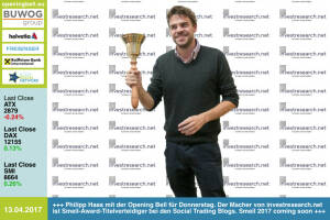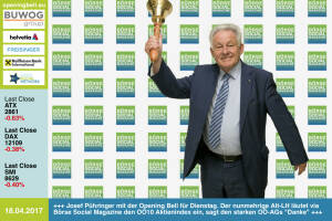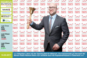18.4.: Josef Pühringer mit der Opening Bell für Dienstag. Der nunmehrige Alt-LH läutet via Börse Social Magazine den OÖ10 Aktienindex ein, sagt den starken börsenotierten OÖ-AGs "Danke" für die Performance, siehe http: www.boerse-social.com ooe10 bzw. http: www.boerse-social.com magazine www.facebook.com groups GeldanlageNetwork 13.4.: Philipp Haas mit der Opening Bell für Donnerstag. Der Macher von http: investresearch.net ist Smeil-Award-Titelverteidiger bei den Social Trading Blogs. Smeil 2017 coming soon http: smeil-award.com , http: wikifolio.com , www.facebook.com groups GeldanlageNetwork 12.4.: Sebastian Leben mit der Opening Bell für Mittwoch. Für boersenradio.at interviewt der Börsen Radio Network Mann nun... » Weiterlesen