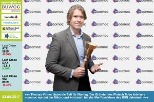 3.4.: Thomas Vittner läutet die Opening Bell für Montag. Der Gründer des Fintech Robo Advisers moomoc war bei der März-, und wird auch bei der Mai-Roadshow des BSN dabeisein www.moomoc.com http: www.boerse-social.com roadshow www.facebook.com groups GeldanlageNetwork 31.3.: Klaus Umek läutet die Opening Bell für Freitag, gleichzeitig Ultimo Q1. Der Gründer von Petrus Advisers sprach gestern bei der BSN Roadshow #68 in der Wiener Privatbank www.facebook.com groups GeldanlageNetwork 30.3.: Elisabeth Rist läutet die Opening Bell für Donnerstag. Die GF der Wiener Privatbank Immobilienmakler sieht gegenläufige Trends beim Wiener Altbau und dem Neubau am Stadtrand. Am 3.4. wird es dazu ein Presse-Roundtable in der Wiener Privatbank gebe... » Weiterlesen