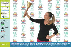 4.4.: Carolina Burger mit der Opening Bell für Dienstag im Rahmen der RunInc.-Invitation für LäuferInnen, die Pressesprecherin der Uniqa Österreich ist begeisterte Hobbysportlerin http: www.runinc.at http: www.runplugged.com www.facebook.com groups GeldanlageNetwork www.facebook.com groups Sportsblogged 3.4.: Thomas Vittner läutet die Opening Bell für Montag. Der Gründer des Fintech Robo Advisers moomoc war bei der März-, und wird auch bei der Mai-Roadshow des BSN dabeisein www.moomoc.com http: www.boerse-social.com roadshow www.facebook.com groups GeldanlageNetwork 31.3.: Klaus Umek läutet die Opening Bell für Freitag, gleichzeitig Ultimo Q1. Der Gründer von Petrus Advisers sprach gestern bei der BSN Roadshow #68 i... » Weiterlesen