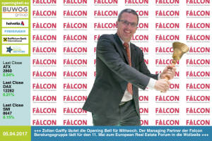 5.4.: Zoltan Galffy läutet die Opening Bell für Mittwoch. Der Managing Partner der Falcon Beratungsgruppe lädt für den 11. Mai zum European Real Estate Forum in die Wollzeile. Infos: office@dmv-immobilien.at www.facebook.com groups GeldanlageNetwork 4.4.: Carolina Burger mit der Opening Bell für Dienstag im Rahmen der RunInc.-Invitation für LäuferInnen, die Pressesprecherin der Uniqa Österreich ist begeisterte Hobbysportlerin http: www.runinc.at http: www.runplugged.com www.facebook.com groups GeldanlageNetwork www.facebook.com groups Sportsblogged 3.4.: Thomas Vittner läutet die Opening Bell für Montag. Der Gründer des Fintech Robo Advisers moomoc war bei der März-, und wird auch bei der Mai-Roadshow des BSN dabeis... » Weiterlesen