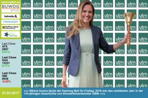 7.4.: Milena Ioveva läutet die Opening Bell für Freitag. 2016 war das zweitbeste Jahr in der 144-jährigen Geschichte von Immobilienentwickler UBM, mehr dazu unter http: www.ubm.eu de news-presse alle-news 6.4.: Christian Drastil, Napoleon und Ritschy Dobetsberger läuten die Opening Bell für Donnerstag. Nach Upload des http: www.boerse-social.com magazine #3 in Richtung Druckerei gehts ab ins Auto zur Invest nach Stuttgart. Auf dem Programm steht das Unter-die-Leute-bringen des 16-seitigen Mini-Magazines für Stuttgart, Schmähführen am Einblicke-Stand und Vorträge bei u.a. wikifolio.com und nextmarkets www.facebook.com groups GeldanlageNetwork 5.4.: Zoltan Galffy läutet die Opening Bell für Mittwoch. Der Managing Partner der Fal... » Weiterlesen