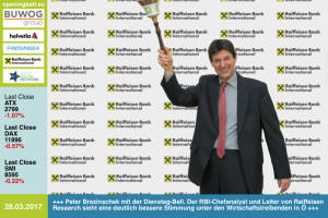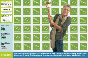 28.3.: Peter Brezinschek mit der Opening Bell für Dienstag. Der RBI-Chefanalyst und Leiter von Raiffeisen Research attestiert akuell eine deutlich bessere Stimmung unter den Wirtschaftstreibenden in Österreich http: rbinternational.com www.facebook.com groups GeldanlageNetwork 27.3.: Nicola Werdenigg-Spiess , Ex-Abfahrtsstar (Olympia-Vierte 1976 in Innsbruck), jetzt http: onlinerin.at mit u.a. Betreuung von KMUsläutet dieOpening Bell für eine Woche mit Theater, Spaziergängen, Compliments, Kreativität und fairem Miteinander www.facebook.com groups GeldanlageNetwork www.facebook.com groups Sportsblogged 24.3.: Wolfgang Praskac läutet die Opening Bell für Freitag. Sein Familienbetrieb mit Sitz in Tulln beherbergt eines der grössten Planze... » Weiterlesen