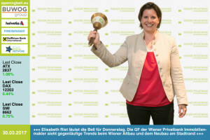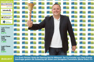 30.3.: Elisabeth Rist läutet die Opening Bell für Donnerstag. Die GF der Wiener Privatbank Immobilienmakler sieht gegenläufige Trends beim Wiener Altbau und dem Neubau am Stadtrand. Am 3.4. wird es dazu ein Presse-Roundtable in der Wiener Privatbank geben http: www.wpb-makler.com www.facebook.com groups GeldanlageNetwork 29.3.: Erwin Stricker läutet die Opening Bell für Mittwoch. Der Co-Founder von Cleen Energy beantragte gestern die Zulassung von 3.570.000 auf den Inhaber lautenden nennbetragslosen Stammaktien zum Geregelten Freiverkehr an der Wiener Börse http: www.cleen-energy.com www.facebook.com groups GeldanlageNetwork 28.3.: Peter Brezinschek mit der Opening Bell für Dienstag. Der RBI-Chefanalyst und Leiter von Raiffeisen Research attesti... » Weiterlesen