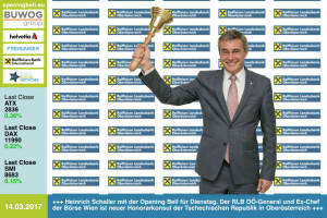 14.3.: Heinrich Schaller mit der Opening Bell für Dienstag. Der RLB OÖ-Generaldirektor und Ex-Chef der Wiener Börse ist neuer Honorarkonsul der Tschechischen Republik in Oberösterreich http: www.rlbooe.at www.facebook.com groups GeldanlageNetwork 13.3.: Dorothee Bauer läutet die Opening Bell für Montag. Mit Deliciouswedding gewann sie unlängst beim Austrian Wedding Award, gestern finishte sie ihren ersten Marathon in Barcelona http: www.deliciouswedding.at www.facebook.com groups Sportsblogged 10.3. : Markus Riederer läutet die Opening Bell für Freitag im Rahmen der RunInc-Invitation. Mit seiner rasant wachsenden Initiative Laufend Helfen unterstützt er laufend (running) & laufend (stetig) schwerkranke Kinder www.facebook.com T... » Weiterlesen
