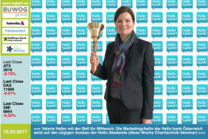 16.3.: Elke Müller mit der Opening Bell für Donnerstag. Mit Scholdan & Comp. hat sie die Kommunikation der heissen Phase beim Zertifkate Award Austria 2017 eingeläutet http: www.zertifikateaward.at http: dieschnellenfressendielangsamen.at www.facebook.com groups GeldanlageNetwork 15.3.: Valerie Heller mit der Opening Bell für Mittwoch. Die Marketingchefin der Hello bank Österreich setzt auf den zügigen Ausbau der Hello Akademie (diese Woche Charttechnik-Seminar) www.hellobank.at c wissen akademie webinare.aspx www.facebook.com groups GeldanlageNetwork 14.3.: Heinrich Schaller mit der Opening Bell für Dienstag. Der RLB OÖ-Generaldirektor und Ex-Chef der Wiener Börse ist neuer Honorarkonsul der Tschechischen Republik in Oberös... » Weiterlesen