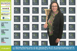 17.3 .: Michaela Mischek-Lainer mit der Opening Bell für Freitag. Als Geschäftsführerin der Entwicklergesellschaft für das Althan Quartier läutet sie die Neugestaltung am Franz-Josefs-Bahnhof (1090 Wien) ein http: www.6b47.com www.facebook.com groups GeldanlageNetwork 16.3.: Elke Müller mit der Opening Bell für Donnerstag. Mit Scholdan & Comp. hat sie die Kommunikation der heissen Phase beim Zertifkate Award Austria 2017 eingeläutet http: www.zertifikateaward.at http: dieschnellenfressendielangsamen.at www.facebook.com groups GeldanlageNetwork 15.3.: Valerie Heller mit der Opening Bell für Mittwoch. Die Marketingchefin der Hello bank Österreich setzt auf den zügigen Ausbau der Hello Akademie (diese Woche Charttechnik-Se... » Weiterlesen