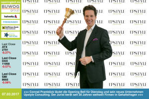 7.3.: Conrad Pramböck läutet die Opening Bell für Dienstag und sein neues Unternehmen Upstyle Consulting. Der Jurist berät seit 20 Jahren weltweit Firmen in Gehaltsfragen www.facebook.com groups GeldanlageNetwork 6.3.: Bosko Skoko läutet die Opening Bell für Montag. Der Ex-Sprecher von S Immo und der Ärztekammer betreut als selbstständiger Kommunikationsberater Kunden aus Wirtschaft, Gesundheit & Lifestyle. Ab der Ausgabe #2 des Börse Social Magazine ist er fixer Autor einer monatlichen Kolumne http: www.kommunikationsmacherei.at http: www.boerse-social.com magazine www.facebook.com groups GeldanlageNetwork 3.3.: Harald Hagenauer mit der Opening Bell für Freitag. Im 2. Börse Social Magazine spricht er für die CIRA im Ro... » Weiterlesen
