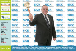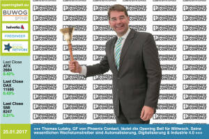 25.1.: Thomas Lutzky , GF von Phoenix Contact, läutet die Opening Bell für Mittwoch. Seine wesentlichen Wachstumstreiber sind Automatisierung, Digitalisierung & Industrie 4.0 www.phoenixcontact.com online portal at 24.1.: Helmut Maier, Geschäftsführer Sick Österreich, läutet die Opening Bell für Dienstag. Mit Sick Appspace hat er eine offene Plattform für Lösungen mit programmierbaren Sensoren von Sick am Start http: www.sick.at www.facebook.com groups GeldanlageNetwork 23.1.: Hans Knauss läutet die Opening Bell für Montag. Am zurückliegenden Weekend war der Ex-Skistar Vorläufer in Kitzbühel, morgen geht es in seiner Heimat Schladming zum Nachtslalom http: www.hans-knauss.com -Runinc-Invitation also nicht nur f&u... » Weiterlesen