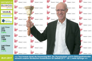 26.1.: Toni Innauer läutet die Opening Bell für Donnerstag. Der Olympiasieger und Ex-Skiflugweltrekordler wünscht unseren Nordischen Kombinierern für das Seefeld-Triple (27.1. - 29.1.) weite Sprünge http: www.innauerfacts.at www.facebook.com groups Sportsblogged http: www.runplugged.com 25.1.: Thomas Lutzky , GF von Phoenix Contact, läutet die Opening Bell für Mittwoch. Seine wesentlichen Wachstumstreiber sind Automatisierung, Digitalisierung & Industrie 4.0 www.phoenixcontact.com online portal at 24.1.: Helmut Maier, Geschäftsführer Sick Österreich, läutet die Opening Bell für Dienstag. Mit Sick Appspace hat er eine offene Plattform für Lösungen mit programmierbaren Sensoren von Sick am Start http: www.sick.... » Weiterlesen