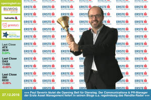 27.12.: Paul Severin läutet die Opening Bell für Dienstag. Der Communications & PR-Manager der Erste Asset Management liefert in seinen Blogs u.a. regelmässig das Rendite-Radar. Beispiel Dezember hier: http: blog.de.erste-am.com 2016 12 21 rendite-radar-dezember-2016 www.facebook.com groups GeldanlageNetwork 24.12.: Die beiden Engel der Wiener Kapitalmarkt-Musikgruppe "Hauptsoch Gsund" läuten die Opening Bell für einen besinnlichen und wunderbaren Weihnachtstag. Frohe Feste! www.facebook.com events 540562056143709 www.facebook.com groups GeldanlageNetwork 23.12.: Marina Daichendt-Eisl und Ernst Huber läuten die Opening Bell für Freitag. Mit Schellhammer & Schattera haben sie sich auf ethisch nachhaltige Bankdienstleistungen spezialis... » Weiterlesen