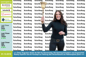 1.12.: Petra Augustyn läutet die Opening Bell für Donnerstag. Die ktschng-Gründerin und Augmented Reality Expertin hat ein Konzept zur Rettung des Herzerlbaums am Rathausplatz parat www.facebook.com Rettet-den-Herzerlbaum-1754086048249602 http: ktschng.com 30.11.: Julia Poyatsyka-Öztürk läutet die Opening Bell für Mittwoch. Als Director of Client Acquisition CIS der Rosinger Group schrieb sie den Russisch-Teil des dreisprachigen Börsegang-PDFs - zu finden unter goo.gl mkWfty http: www.rosinger-gruppe.de www.facebook.com groups GeldanlageNetwork 29.11.: Friedrich Strasser , Vorstandsmitglied und Partner der Bank Gutmann, läutet die Opening Bell für Dienstag. Er gilt u.a. als Experte auf dem Gebiet "Nachhaltiges Investieren" www.gutmann.at ... » Weiterlesen