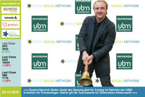 2.12.: Rupert-Heinrich Staller läutet die Opening Bell für Freitag im Rahmen der UBM-Invitation für Privatanleger. Staller gilt als Top-Experte für Österreichs Aktienmarkt http: www.openingbell.eu http: www.ubm.at www.facebook.com groups GeldanlageNetwork 1.12.: Petra Augustyn läutet die Opening Bell für Donnerstag. Die ktschng-Gründerin und Augmented Reality Expertin hat ein Konzept zur Rettung des Herzerlbaums am Rathausplatz parat www.facebook.com Rettet-den-Herzerlbaum-1754086048249602 http: ktschng.com 30.11.: Julia Poyatsyka-Öztürk läutet die Opening Bell für Mittwoch. Als Director of Client Acquisition CIS der Rosinger Group schrieb sie den Russisch-Teil des dreisprachigen Börsegang-PDFs - zu finden unter goo.g... » Weiterlesen
