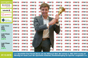 7.12.: Sporthilfe-Chef Harald Bauer mit der Opening Bell für Mittwoch. Bei seinem 4. Sport & Business Circle wurde am Montag ein neuer (von der Sporthilfe initiierter) Studienlehrgang für Sportler vorgestellt. Information & Bewerbung zum Lehrgang unter http: www.fokus-zukunft.at http: www.sporthilfe.at http: www.runplugged.com baa www.facebook.com groups Sportsblogged 6.12.: Günther Matzinger (Rookie), Rolf Majcen (2.), Peter Haidenek (1.) und Damian Izdebski (3.), die Sieger des Runplugged Business Athlete Award 2016, läuten die Bell für Dienstag http: www.runplugged.com baa Bilder: http: runplugged.com 2016 12 06 business_athlete_award_2016_peter_haidenek_siegt#bild_59130 www.facebook.com groups GeldanlageNetwork www.facebook.com groups Spo... » Weiterlesen