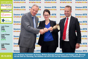 25.10.: Andreas Feuerstein (S Immo), Bettina Schragl (Immofinanz) und Holger Lüth (Buwog) mit der Opening Bell für Dienstag. Sie bildeten die Immo-ATX-Unit auf der BSN Roadshow im Reitersaal - Präsentationen unter http: boerse-social.com virtuellefinanzmarktmesse Immo-ATX-Sonderstrecke unter http: www.boerse-social.com fachheft (jüngste Ausgabe, Seiten 42 bis 51) 24.10.: Elis Karner mit der Opening Bell für Montag.Die C.I.R.A. -Generalsekretärin schmücktein der Vorwoche ihre Jahreskonferenz 2016 mit den neuen Austrian Financial Communications Awards, dutzende Bilder unter http: www.photaq.com page index 2805 http: www.cira.at 21.10.: Christian Scheid läutet die Freitag-Bell. Der Chefredakteur von Zertifikate Austria war gestern beim C... » Weiterlesen