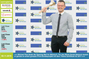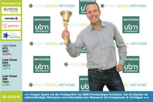 2.11.: Michael Plos läutet die Opening Bell für Mittwoch. Für das Börse Social Network bastelt er gerade an einem grossen Print-Sonderprojekt mit dem Thema Zertifikate für 2017 http: www.boerse-social.com michael.plos@boerse-social.com . 31.10.: Roman Tacho läutet die Opening Bell für Montag im Rahmen der RunInc.-Invitiation für Läufer. Am Samstag bewältigte er beim Wien Rundumadum Bewerb satte 130 Kilometer. Laufend. http: www.wien-rundumadum.at http: www.runinc.at http: www.runplugged.com 28.10.: Gregor Sperk mit der Opening Bell für Freitag im Rahmen derUBM-Privatanleger-Invitation. Der Ex-Banker ist selbstständiger Börsianer und unterstützt sein Research mit Kongressen und Vorträgen http: www.ubm.a... » Weiterlesen