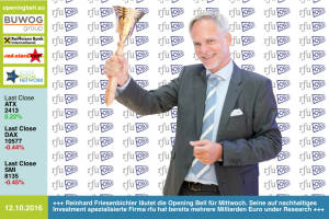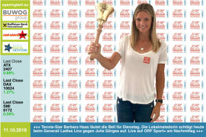 13.10.: Christian Grohs mit der Opening Bell für Donnerstag. Bei der Hamburger Fintech Week nahm der FAIT-Founder gerade beim Hackathon teil und baute in 30 Stunden eine Banken-App http: www.fait.at www.bankathon.net 12.10.: Reinhard Friesenbichler läutet die Opening Bell für Mittwoch. Seine auf nachhaltiges Investment spezialisierte Firma rfu hat bereits mehrere Milliarden Euro under Research http: www.rfu.at 11.10.: Tennisstar Barbara Haas läutet mit eigener "Generali Ladies Linz-Bell" (siehe HIER ) für Dienstag. Die Lokalmatadorin schlägt heute beim Generali Ladies Linz gegen Julia Görges auf. Live auf ORF Sport+ am Nachmittag http: www.generali-ladies.at http: tv.orf.at program orfsportplus www.facebook.com barbarahaastennis 10... » Weiterlesen