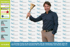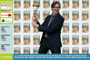 14.10.: Josef Chladek läutet die Opening Bell für Freitag. Der Co-Founder des Börse Social Network hat die Logistik rund um den Fachheft-132-Seiter zur Gewinn-Messe geschupft http: www.grasl.eu http: www.boerse-social.com fachheft - Bilder vom Andruck bei Grasl unter http: photaq.com page index 2390 13.10.: Christian Grohs mit der Opening Bell für Donnerstag. Bei der Hamburger Fintech Week nahm der FAIT-Founder gerade beim Hackathon teil und baute in 30 Stunden eine Banken-App http: www.fait.at www.bankathon.net 12.10.: Reinhard Friesenbichler läutet die Opening Bell für Mittwoch. Seine auf nachhaltiges Investment spezialisierte Firma rfu hat bereits mehrere Milliarden Euro under Research http: www.rfu.at 11.10.: Tennisstar Barbara Haas l... » Weiterlesen