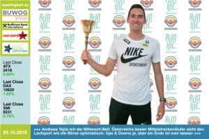 5.10.: Andreas Vojta mit der Opening Bell für Mittwoch im Rahmen der RunInc-Invitation. Österreichs bester Mittelstreckenläufer der vergangenen Jahre sieht den Laufsport wie die Börse optimistisch: Ups & Downs ja, aber am Ende ist man besser www.facebook.com andreasvojta http: www.runinc.at http: www.runplugged.com 4.10.: Eine Opening Bell nicht nur für Dienstag, sondern eine immer-wiederkehrende für CSR-Circles: Bonus Vorsorgekasse Chef Peter Deutsch und Eventmanagerin Cornelia Dankl läuten für nachhaltige Investments http: www.bonusvorsorge.at http: www.openingbell.eu 3.10.: Christoph Boschan mit der Opening Bell für Montag. Der neue CEO der Wiener Börse läutet damit auch einen hoffentlich starken Q4-Handel an Öst... » Weiterlesen