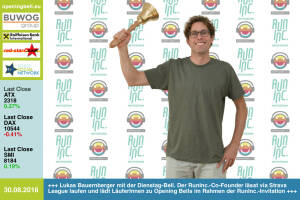 30.8.: Lukas Bauernberger mit der Opening Bell für Dienstag. Der RunInc.-Co-Founder und Mitarbeiter der WACHAUmarathon GmbH lässt via Strava League sporteln und lädt LäuferInnen zu Opening Bells im Rahmen der RunInc.-Invitation http: www.runinc.at http: www.runinc.at 2016 08 25 runinc-strava-league http: www.wachaumarathon.com 29.8.: Christina Oehler und Andreas Kern läuten die Opening Bell für Montag. wikifolio.com wird am 28.9. bei der Privatanleger-Roadshow "BSN Einblicke" in Wien präsentieren http: www.wikifolio.com http: www.boerse-social.com roadshow 26.8.: Ralph Gollner läutet die Opening Bell für Freitag. Der Black Swan Founder kämpft darum, dass Financial Education und Behavioral Finance einen höheren Stellenwe... » Weiterlesen