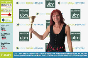 1.9.: Linda Benkö läutet die Opening Bell für Donnerstag. Die Wirtschaftsjournalistin (u.a. lange Jahre beim WirtschaftsBlatt) mit Schwerpunkt Immobilienmarkt tut dies im Rahmen der UBM-Invitation für Privatanleger http: www.ubm.at 31.8.: Die Macher des LC Wienerwaldschnecken ( Andreas Schweighofer , Lilian Kuster , Thomas Baucek und Beate Baucek ) sowie Vereinsmitglied Christian Drastil läuten die Opening Bell für Mittwoch im Rahmen der RunInc.-Invitation für die Laufcommunity. Am Wochenende fand der 5. Wienerwaldlauf statt. Ergebnisse und mehr als 1000 Bilder vom Event unter http: www.wienerwaldlauf.at Runplugged-Bilder unter http: www.photaq.com page index 2687 http: www.runinc.at 30.8.: Lukas Bauernberger mit der Opening Bell für Di... » Weiterlesen