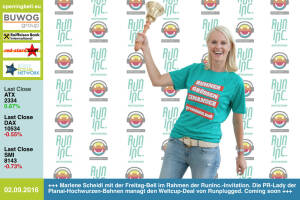 2.9.: Marlene Scheidl mit der Opening Bell für Freitag im Rahmen der RunInc.-Invitation. Die PR-Managerin der Planai-Hochwurzen-Bahnen managt den Weltcup-Deal von Runplugged. Coming soon ... http: www.planai.at http: www.runinc.at http: www.runplugged.com 1.9.: Linda Benkö läutet die Opening Bell für Donnerstag. Die Wirtschaftsjournalistin (u.a. lange Jahre beim WirtschaftsBlatt) mit Schwerpunkt Immobilienmarkt tut dies im Rahmen der UBM-Invitation für Privatanleger http: www.ubm.at 31.8.: Die Macher des LC Wienerwaldschnecken ( Andreas Schweighofer , Lilian Kuster , Thomas Baucek und Beate Baucek ) sowie Vereinsmitglied Christian Drastil läuten die Opening Bell für Mittwoch im Rahmen der RunInc.-Invitation für die Laufcommunity. Am Wo... » Weiterlesen